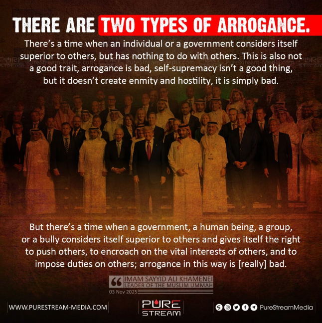 “(…) There are two types of arrogance. There’s a time when an individual or a government considers itself superior to others, but has nothing to do with others. This is also not a good trait, arrogance is bad, self-supremacy isn’t a good thing, but it doesn’t create enmity and hostility, it is simply bad. But there’s a time when a government, a human being, a group, or a bully considers itself superior to others and gives itself the right to push others, to encroach on the vital interests of others, and to impose duties on others; arrogance in this way is [really] bad. (…)”