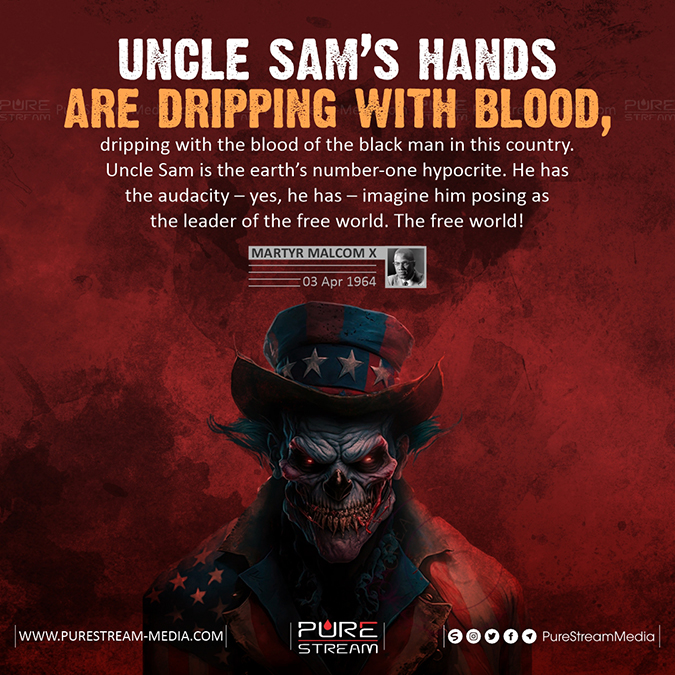 “(…) Uncles Sam’s hands are dripping with blood, dripping with the blood of the black man in this country. Uncle Sam is the earth’s number-one hypocrite. He has the audacity – yes, he has – imagine him posing as the leader of the free world. The free world! (…)”