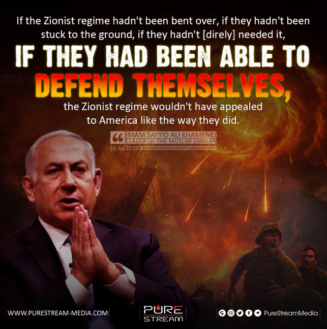 “(…) If the Zionist regime hadn’t been bent over, if they hadn’t been stuck to the ground, if they hadn’t [direly] needed it, if they had been able to defend themselves, the Zionist regime wouldn’t have appealed to America like the way they did. (…)”
