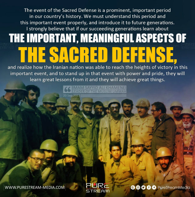 “(…) The event of the Sacred Defense is a prominent, important period in our country’s history. We must understand this period and this important event properly, and introduce it to future generations. I strongly believe that if our succeeding generations learn about the important, meaningful aspects of the Sacred Defense, and realize how the Iranian nation was able to reach the heights of victory in this important event, and to stand up in that event with power and pride, they will learn great lessons from it and they will achieve great things. (…)”