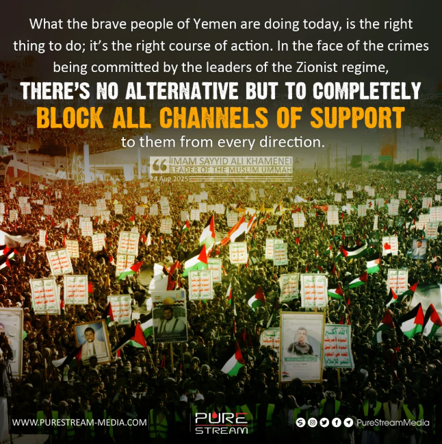 “(…) What the brave people of Yemen are doing today, is the right thing to do; it’s the right course of action. In the face of the crimes being committed by the leaders of the Zionist regime, there’s no alternative but to completely block all channels of support to them from every direction. (…)”