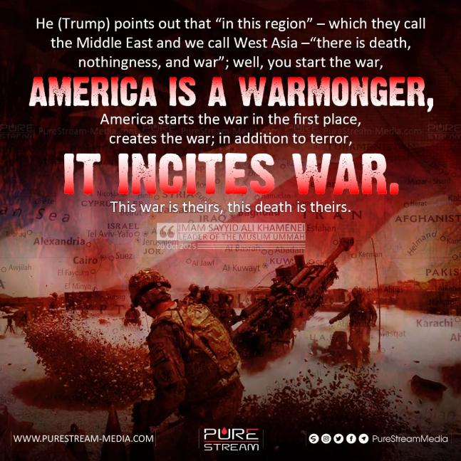 “(…) He [Trump] points out that ‘in this region’ – which they call the Middle West and we call West Asia – ‘there is death, nothingness, and war’; well, you start the war, America is a warmonger, America starts the war in the first place, creates the war; in addition to terror, it incites war. This war is theirs, this death is theirs. (…)”