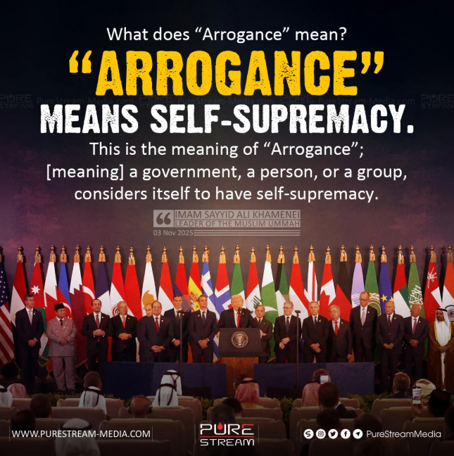 “(…) What does ‘Arrogance’ mean? ‘Arrogance’ means self-supremacy. This is the meaning of ‘Arrogance’; [meaning] a government, a person, or a group, considers itself to have self-supremacy. (…)”
