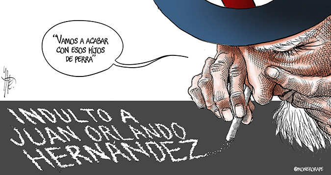 Acabar com quem, Tio Sam? Com “presidentes narcotraficantes” latino-americanos e caribenhos assim designados por sua mente colonialista? Com a prisão e soltura, se é que assim estava em seus domínios, do Juan Orlando Hernández, Ex-“Presidente” de Honduras, servil a você, cujo nome está a cheirar no desenho e foi acusado e aprisionado pela mesma tipificação criminal? Ou acabar com o milímetro de idoneidade dos seus julgamento$, fazer uso do sarcasmo totalmente escancarado e liberá-lo em dias de Eleiçõe$ hondurenhas e de cerco ao valoroso território bolivariano motivado pelo tema da “guerra ao tráfico”… Interrogações triviais.